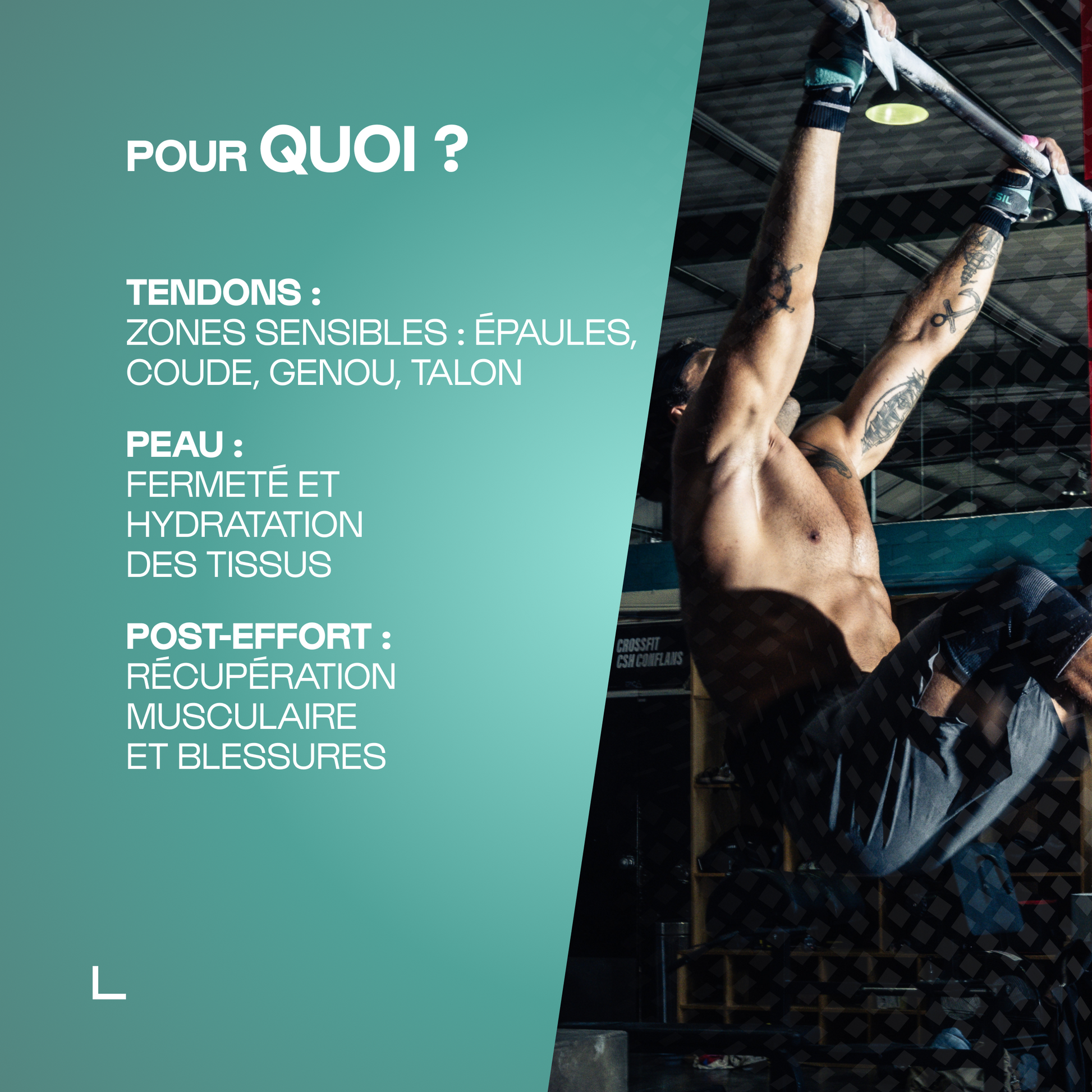 En complémentation, le collagène marin aide à renforcer et protéger les tendons tout en soulageant les zones sensibles comme les épaules, les coudes, les genoux ou les talons. Il contribue aussi à améliorer la fermeté et l’hydratation des tissus cutanés, pour une peau plus ferme et résistante. Après l’effort, il soutient la récupération musculaire et participe à la prévention des blessures, permettant de maintenir un rythme d’entraînement optimal.