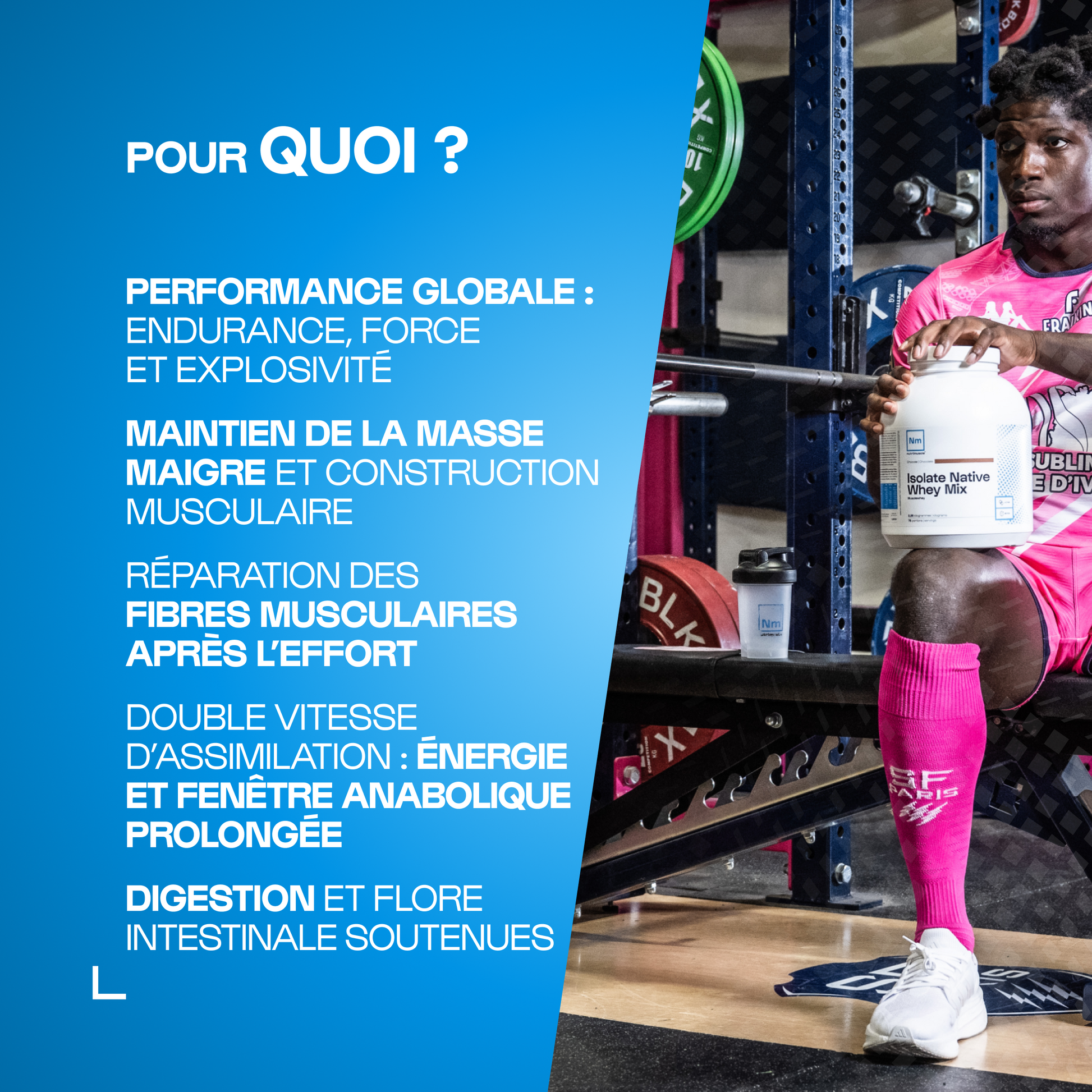 L’Isolate Native Whey Mix – Musclewhey Nutrimuscle s’adresse aux athlètes en phase de prise de masse, de sèche ou de maintien, cherchant une protéine complète et performante. Elle convient aussi aux pratiquants de sports d’endurance souhaitant préserver leur masse musculaire, aux sportifs recherchant une combinaison idéale entre plaisir, digestibilité et performance, ainsi qu’aux actifs désireux d’une collation protéinée fiable et efficace au quotidien.